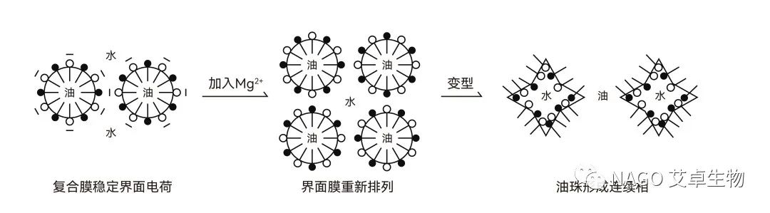 分散相的微球狀液滴直徑一般在0.05~10μm之間時,微小液球會相互聚集,力圖縮小界面積,降低界面能,分散的微小液球逐漸合并,液滴逐漸變大,最后使油和水重新分開成為兩層液體,油和水又恢復到原來狀態。如圖1