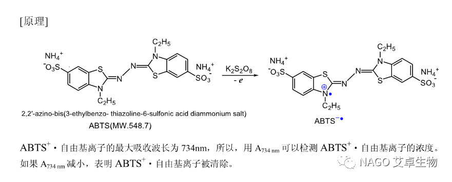 ABTS與過硫酸鉀反應生成綠色的ABTS+。具有抗氧化性的物質可抑制ABTS+的生成,ABTS+在可見光區最大吸收峰734 nm處,測定吸光度,其光度值的大小可定量得出反應物質的自由基清除能力。即其吸光度值越低,具有抗氧化性的物質清除ABTS自由基的能力越強。
