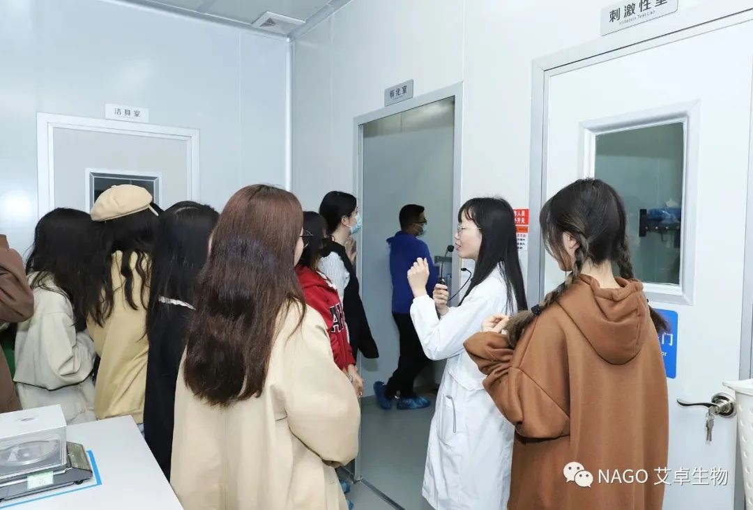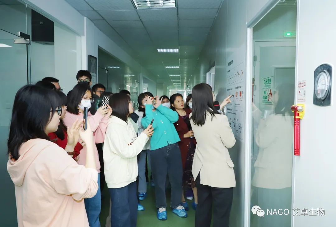 艾卓生物分析中心冼主任和技術支持周曉婷帶領肇慶學院師生參觀艾卓實驗室,讓大家了解產品的研發、應用、產品質控、功效評價以及微生物領域相關知識。