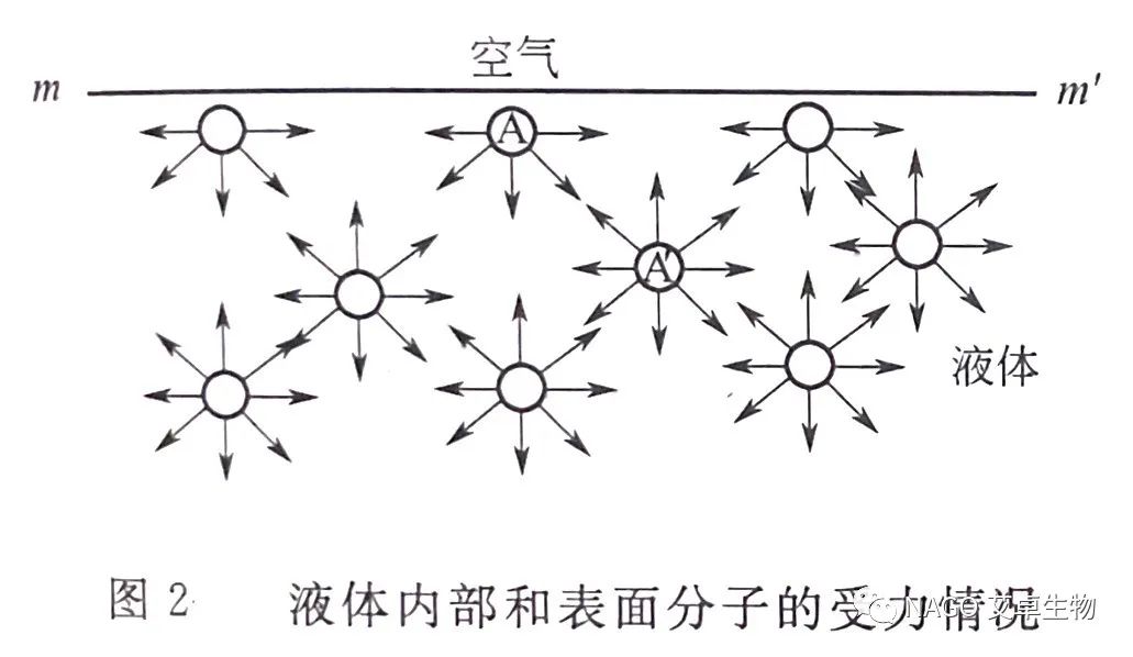 表面張力是由于液體表面范德華力不平衡引起的(如圖2)。在液體內部,平均來說分子受到周圍鄰近分子的吸引力是對稱和平衡的;但在液體表面,因為上面氣相中分子的密度很小,它對液體分子的吸引力可以忽略,表面的分子只受到下面液相分子的吸引。結果,表面的分子總是盡力向液體內部擠,從而,使液體表面有張力,有自動收縮的傾向。當分子從內部移向表面時,必須克服表面分子所受到的指向內部的合力作用,故需要供給能量。增加液體的表面積就是把一定數量的內部分子變為表面上的具有較高能量的分子。為此,外界必須對體系做功,導致體系能量升高。對液體表面自由能做出貢獻的分子間相互作用力隨液體組成和狀態而異,可以是范德華力的各種成分、氫鍵、金屬鍵等。總之,表面上存在過剩能量和表面張力現象是構成界面的兩體相性質不同和分子間存在相互作用的結果。