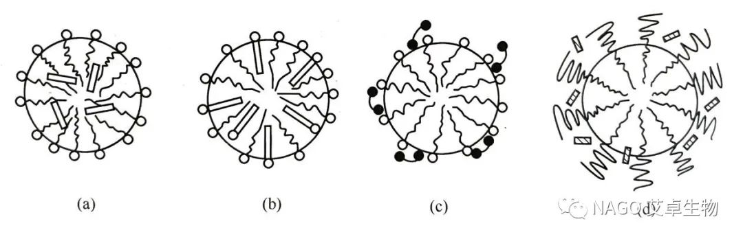 聚氧乙烯鏈間的增溶:以聚氧乙烯基為親水基團的非離子表面活性劑,通常被增溶物包藏在膠束外層的聚氧乙烯鏈中,如圖1(d)所示